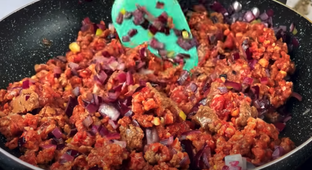 Posiekaj fioletową cebulę. Pokrój pomidora w kostkę. Zetrzyj ser mozzarella. Na patelni rozgrzej trochę oleju roślinnego. Dodaj posiekaną cebulę i smaż, aż będzie miękka. Dodaj mięso mielone, sól, pieprz i paprykę. Smaż, aż mięso będzie dobrze przyrumienione.
