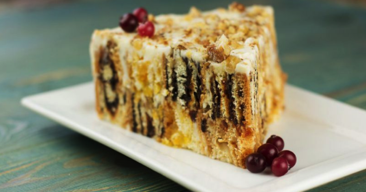 Formę posmaruj 3 łyżkami ubitej śmietany (najlepiej, jeśli zrobisz to na folii spożywczej lub papierze do pieczenia). Podziel kawałki ciasta na dwie równe części, z każdej z nich ułóż warstwy, przedzielając obie śmietaną. Tak przygotowany smakołyk schowaj do lodówki, najlepiej na całą noc.
