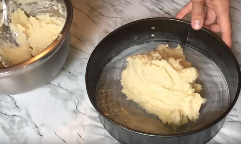 Teraz możemy włączyć piekarnik – nastawiamy na 180 stopni. Okrągłą tortownicę wykładamy papierem do pieczenia, smarujemy olejem. Wykładamy kolejno warstwy: ziemniaki, mięso – nakłuwamy nożem i polewamy śmietaną. Wszystkie warstwy oczywiście powinny być równomiernie rozprowadzone w foremce.