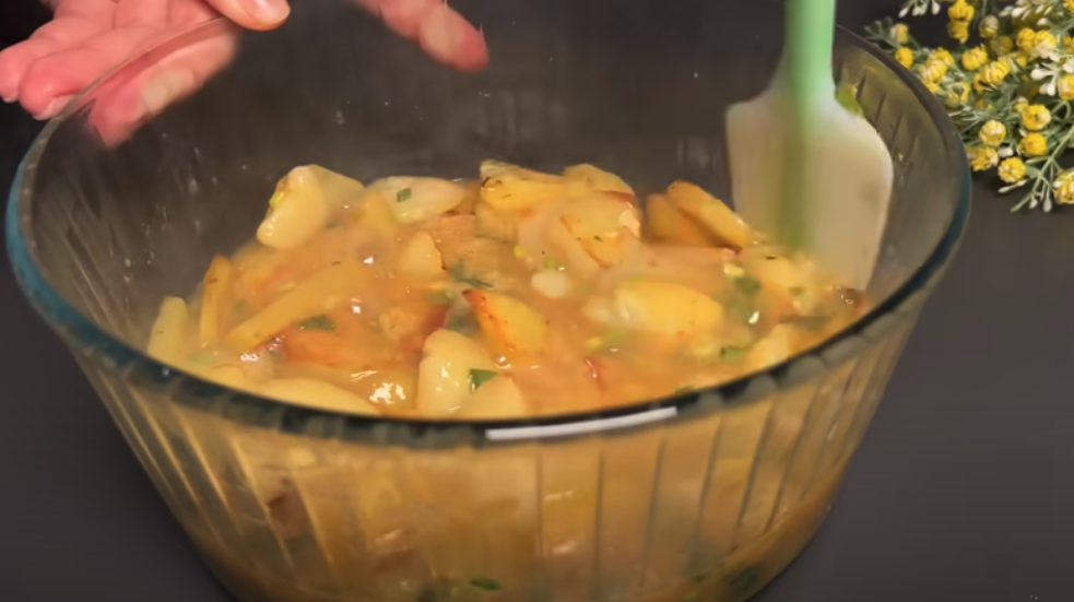 Usmaż ziemniaki na złoty kolor. Dodaj sól i przyprawę do ziemniaków. Umieść usmażone ziemniaki w misce. Wlej masę jajeczną i dobrze wymieszaj. Przełóż wszystko do formy o średnicy 20 cm. Zetrzyj 50 g mozzarelli i posyp wierzch. Wstaw do piekarnika nagrzanego do 180°C na 40 minut. Posiekaj 100 g grzybów.
