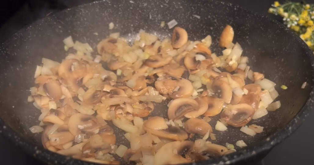 Na patelnię wlej olej i podsmaż grzyby. Posiekaj cebulę i dodaj do grzybów. Smaż do miękkości. Dodaj posiekany czosnek i paprykę. Smaż przez kilka minut, aż warzywa będą miękkie. Dodaj 10 g sosu sojowego i 10 g ketchupu do warzyw na patelni. Dobrze wymieszaj i podsmaż przez kilka minut. Posiekaj świeży koperek.