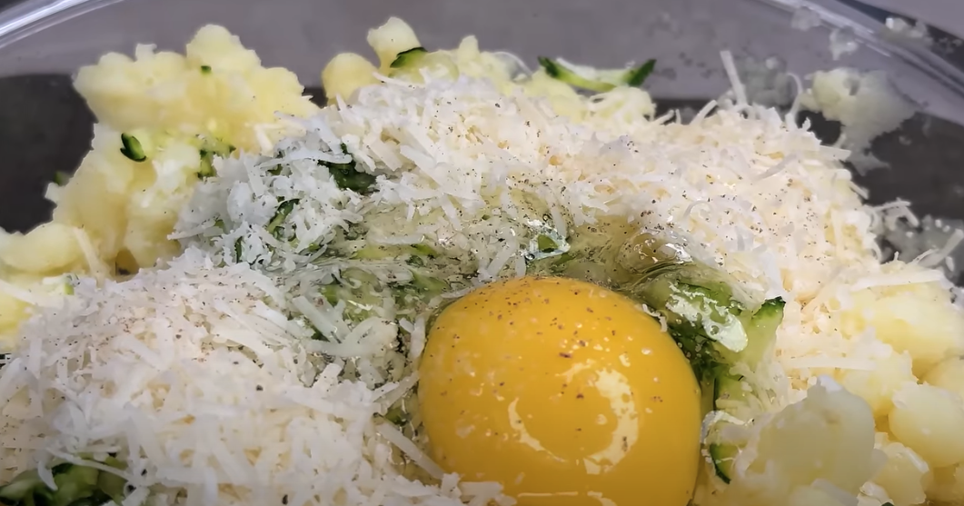 W dużej misce rozgnieć ugotowane ziemniaki. Dodaj startą cukinię, 80 g startego parmezanu, sól, pieprz i szczyptę gałki muszkatołowej. Dokładnie wymieszaj. Dodaj 2 jajka i ponownie dobrze wymieszaj. Zmiel płatki kukurydziane na drobno w blenderze lub rozgnieć je ręcznie w torebce.