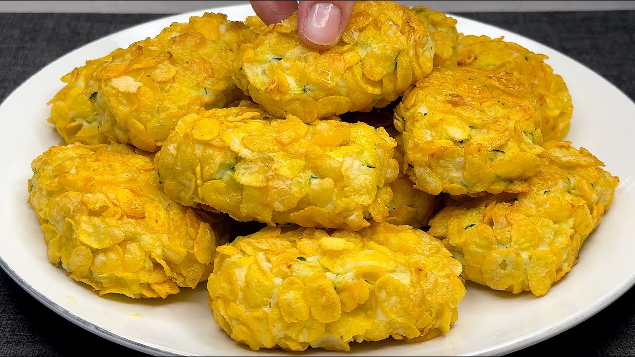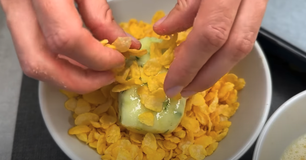 Uformuj z masy ziemniaczano-cukiniowej kotlety i obtocz je w płatkach kukurydzianych. Przełóż kotlety na blachę wyłożoną papierem do pieczenia i skrop oliwą z oliwek. Piecz w nagrzanym piekarniku w temperaturze 180°C przez około 20 minut, aż będą złociste i chrupiące.