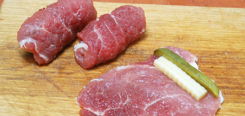 Pokój ogórki i ser na pionowe słupki. Następnie weź po jednym kawałku sera i ogórka, rozłóż je na brzegu plastra mięsa i zawiń w małą roladkę, zabezpieczając końce wykałaczkami. Każdego zraza owiń jeszcze nitką w samym środku, by upewnić się, że się nie rozpadną.
